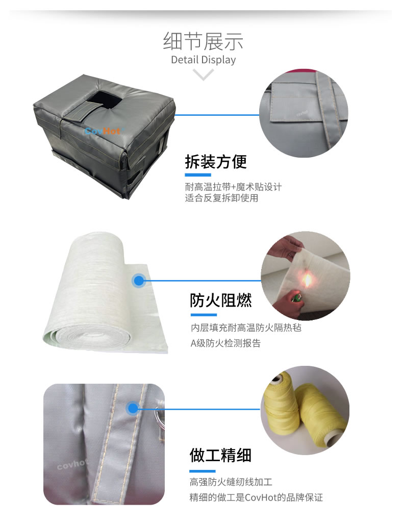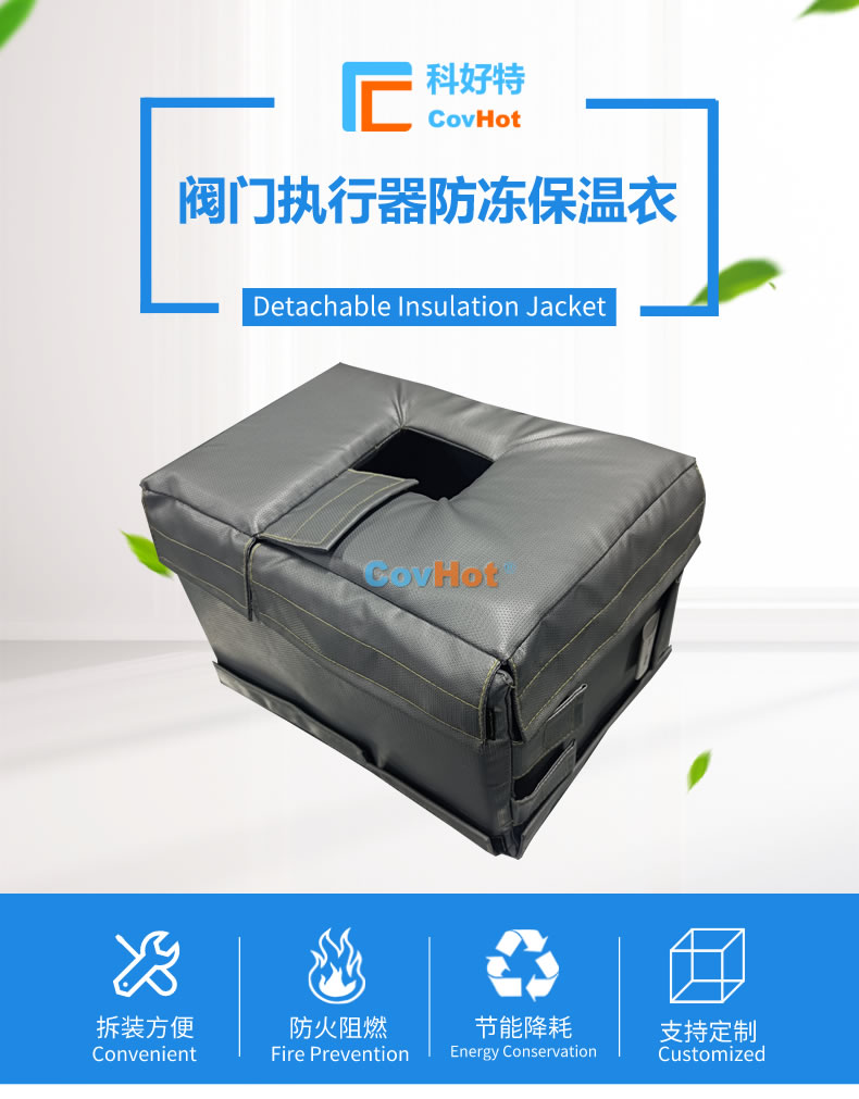 執(zhí)行器防凍保溫套由內(nèi)隔熱包裹層、中間隔熱保溫層、外隔熱防護層以及電伴熱系統(tǒng)組成,根據(jù)各種型號的執(zhí)行器工作環(huán)境、外形尺寸等量身定制而成。